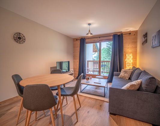 In a preserved setting, this residence on the edge of the forest offers direct access to the slopes while being just a few minutes away from the shops and restaurants of the charming village resort as well as the Bourg, the liveliest main street in Valmorel.